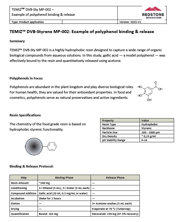 Redstone has currently 20 DVB-Styrene adsorbent variants in-house that are similar in specifications, but differ in resin architecture which could give different selectivities and thus different separation results depending on the application.